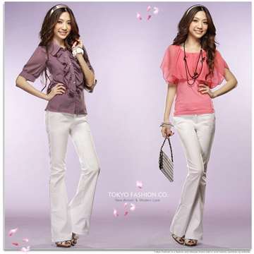На правильный подбор верха очень влияет фасон брюк. Так белые брюки с завышенной талией предполагают ношение короткого верха, либо верха заправленного в брюки. Для узких брюк лучше выбирать слегка приталенные или летящие блузы. А вот для расклешенных белых брюк прекрасно подойдут облегающие топы и рубашки.