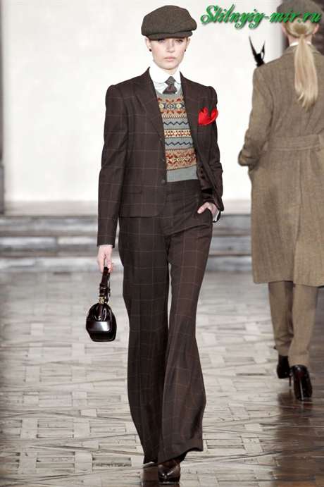 Им свойственны вертикальные линии силуэта, завышенная талия в жакетах, расширенные книзу брюки.