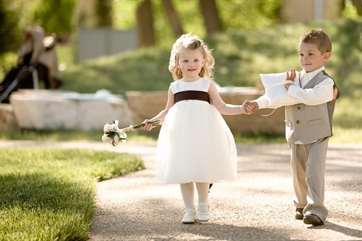 - Во время церемонии детям можно доверить важные роли. Например, девочка может нести фату или шлейф невесты, рассыпать лепестки цветов, держать подушечку с кольцами или букет невесты, пока молодожены обмениваются кольцами и целуются.