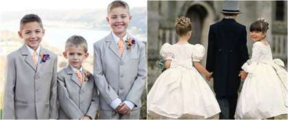 Обычно мальчики и девочки одеваются так, чтобы напоминать жениха и невесту. Девочки выбирают красивые пышные платья, в которых они выглядят как настоящие принцессы. В таких нарядах уместны бантики и оборки, что придает образу особую милоту и непосредственность. Не обязательно делать сложные прически — достаточно просто завить волосы и зафиксировать их лаком. В качестве аксессуаров подойдут маленькие диадемы, венки, обручи с декором, атласные ленты, а также красивые заколки и шпильки. Можно дополнить образ ангельскими крыльями, которые легко найти в магазинах детской одежды.