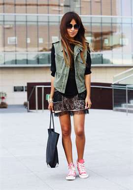 Сочетайте кеды с женственными нарядами. Кеды отлично смотрятся в сочетании с платьями и юбками, особенно с легкими летними моделями. Это создаст контраст между спортивным и романтичным стилем, добавив образу игривости.