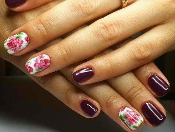 Не теряет своей актуальности и винный маникюр с цветочными мотивами. Нежный цветок, выделенный на одном ногте, добавит изюминку и разнообразие в классический винный дизайн.