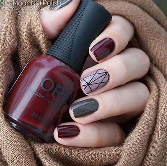 - Один ноготок можно вскрыть лаком цвета металлик – он прекрасно разбавит темный винный цвет.