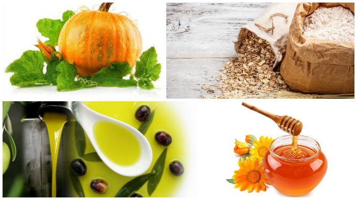 Кроме того, нужно будет взять десертную ложку меда. Если мед густой, то нужно слегка подогреть его на водяной бане и смешать с двумя чайными ложками оливкового нерафинированного масла. Можно также использовать другое косметическое масло, например, виноградной косточки. Медово-масляную смесь смешивают с тыквенным соком и овсяной мукой. Муки нужно добавить столько, чтобы состав приобрел консистенцию густой сметаны.