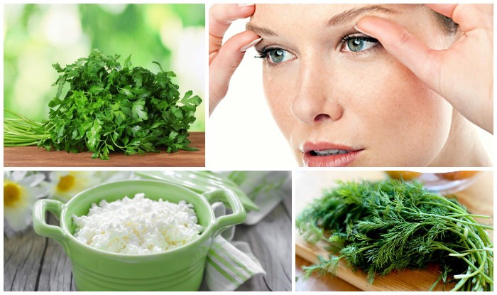 Хорошо омолаживает и увлажняет зеленая творожная маска. Для ее приготовления используют свежий творог и зелень петрушки и укропа. Взять по пучку зелени, измельчить в блендере или мелко нарезать и растереть в ступке. Смешать в равных количествах зеленое пюре и творог. Накладывать на кожу век на полчаса.