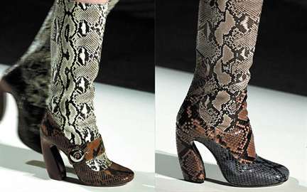Женская обувь из рептилий опять станет хитом в этом сезоне. Дизайнеры отдают предпочтение обуви, выполненной из змеиной кожи. Это могут быть ботильоны, туфли, сапоги. Популярны будут однотонные модели, выполненные в светлых или темных оттенках.