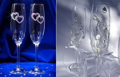 Декорированные бокалы для молодоженов | Стеклянные бокалы, акриловые краски по стеклу, контуры по стеклу, кисти, стразы, клей для страз, ленты | 1. Обезжирьте поверхность бокалов. 2. Нанесите контуром узоры или инициалы. 3. Раскрасьте элементы акриловыми красками. 4. Приклейте стразы. 5. Завяжите ленты на ножке бокала. |