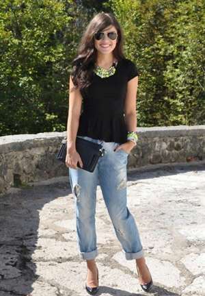 - Самый актуальный вариант — длинная черная блузка и потертые синие джинсы. Обувь для такого лука лучше подбирать на толстой подошве.
