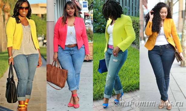 Полненькие дамы могут составить прекрасный комплект из темных джинсов и классического приталенного жакета. Эффектный образ можно дополнить элегантной кофточкой из кашемира и туфлями на устойчивом каблуке.