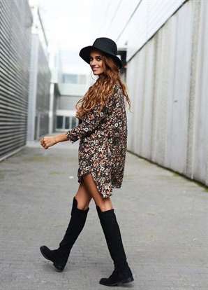- Платья. Подойдут мини и миди модели. Изделие может быть расклешённым или прямым, облегающим или свободным. Если речь идёт о сапогах ботфортах без каблука, эффектным будет их сочетание со спортивной туникой.