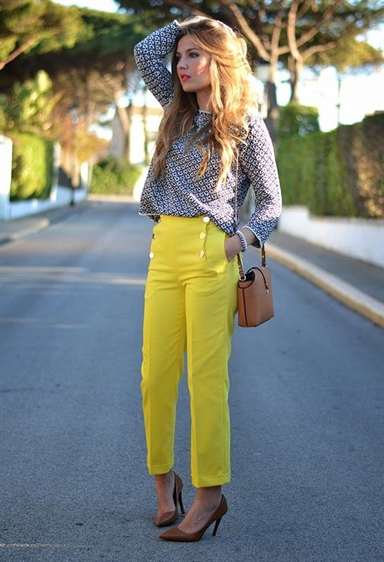 Потрясающую комбинацию создадут желтые брючки и зеленого цвета блейзер или блуза. Элегантный наряд дополнят сумочка и обувь под цвет верха и украшения под цвет брюк.