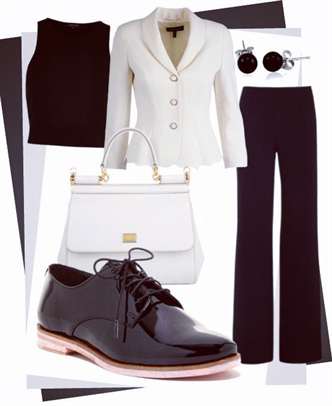 Черные лаковые дерби станут отличным выбором для офисной обстановки, так как они прекрасно смотрятся с классическими черными брюками. В этом случае стоит надеть черные, предпочтительно капроновые, носки. В качестве верха идеально подойдут белая водолазка или блуза с классическим кроем.