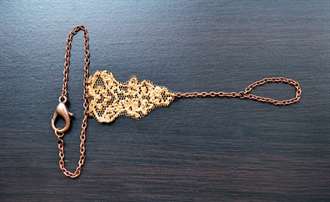 - Подготовьте небольшой фрагмент кружева, клей ПВА, цепочку, акриловую краску золотого или серебристого оттенка, кисточку, застежку, соединительные кольца, ножницы и плоскогубцы.
