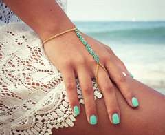 - Классический браслет-кольцо. Представляет собой браслет из цепочки, соединенный с кольцом или кольцами. Вместо кольца может быть цепочка, которая одевается на палец. Раньше такое украшение часто делали из драгоценных металлов. К примеру, выполненная из золота или из серебра бижутерия свидетельствовала о достатке семьи. Сегодня все реже можно встретить золотые и серебряные украшения. Чаще всего их носят женщины, придерживающиеся стиля этно или бохо.
