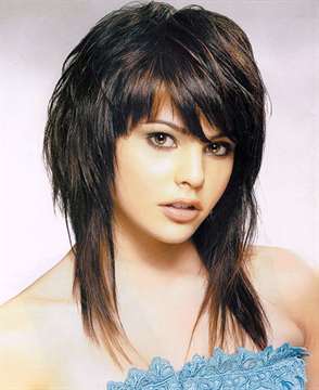 - Треугольная чёлка – классический вариант, который сегодня может быть как косой, так и рваной. Среди современных исполнений стоит выделить ассиметричную чёлку, достигающую нижних локонов.