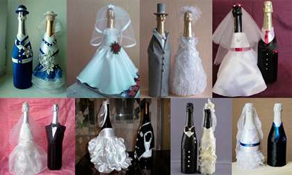 В последнее время все чаще можно встретить бутылки, оформленные в виде жениха и невесты. Их наряжают в фраки и пышные платья, применяя ленты и кружево. В интернете легко найти множество креативных идей для таких «новобрачных».