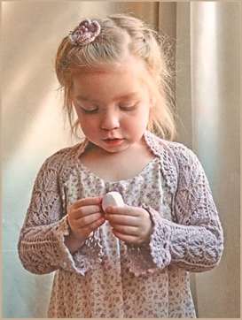 Третья модель – детское болеро синего цвета. На фото девочка улыбается – наверняка радуется тому, что у нее теперь есть такое замечательное болеро: удобное, красивое и, что самое главное, теплое. А маму, которая будет вязать эту модель, порадует несложная схема и улыбка любимой дочери.