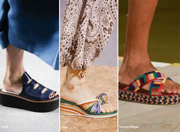 Платформа и танкетка | Массивные подошвы, придающие рост и устойчивость. Актуальны как для повседневных, так и для вечерних образов. | Декор из рафии, плетение из джута, яркие принты на платформе, прозрачные вставки. |